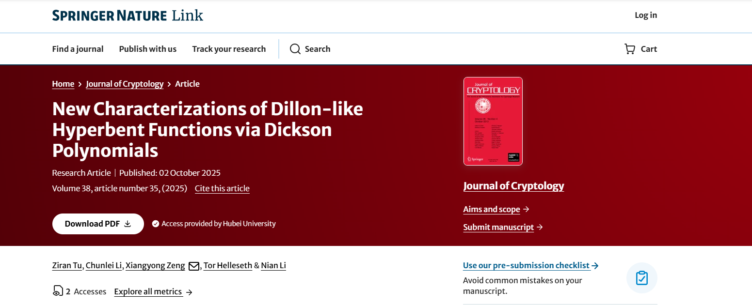 公司密码学团队在密码学顶刊《Journal o...