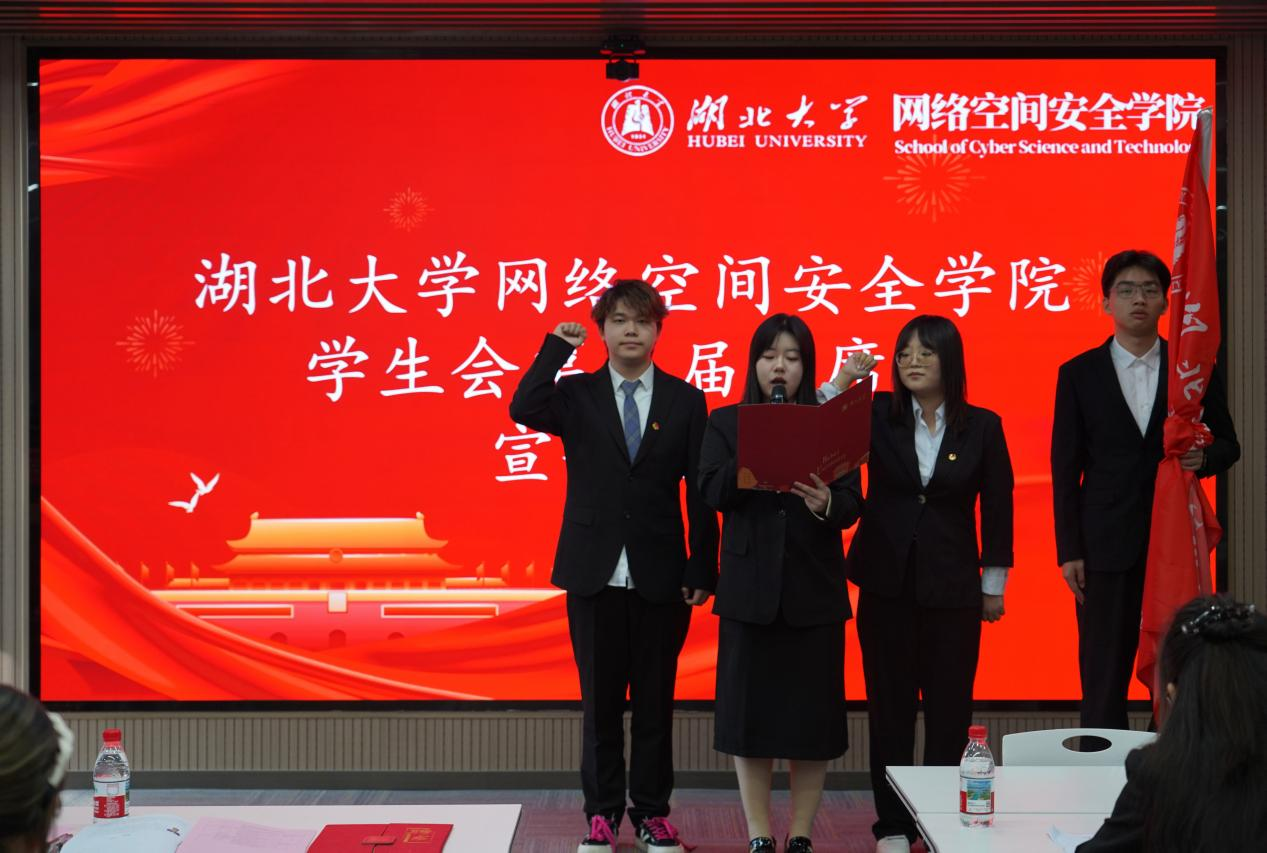 两届主席团成员交接会旗,新一届主席团宣誓就职。