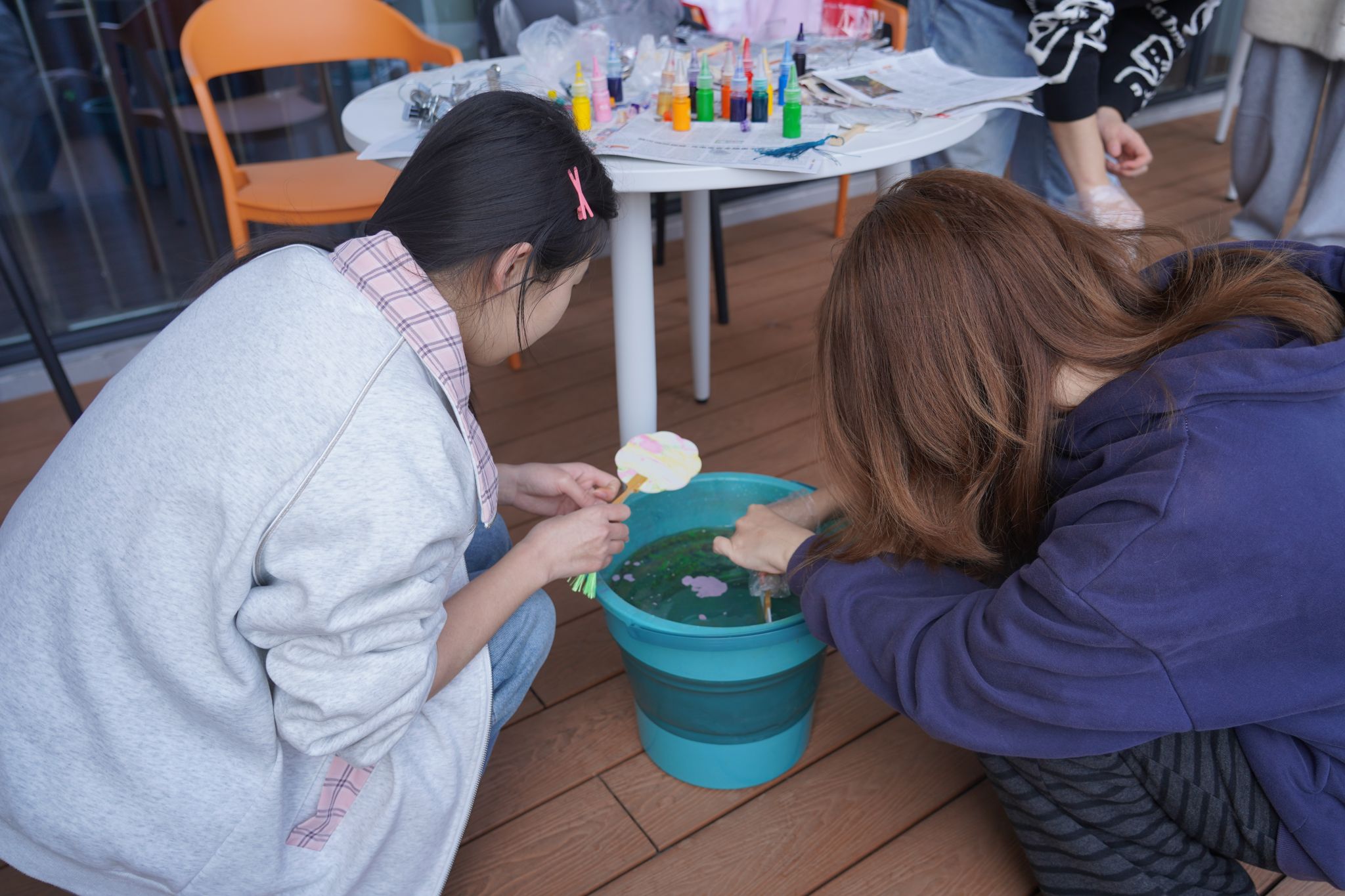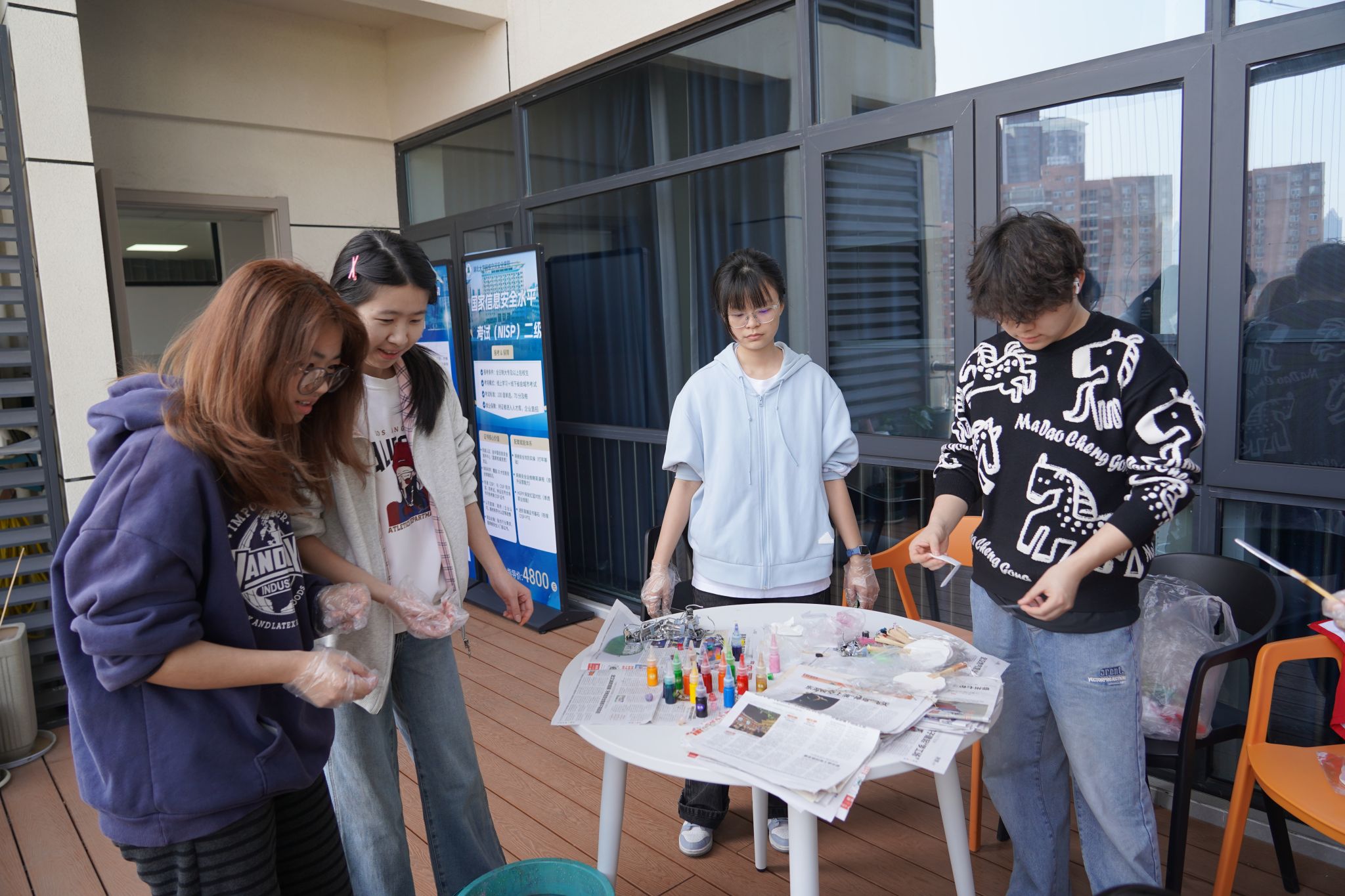 活动现场,公司精心布置的阳台焕然一新。新栽种的绣球花与郁金香竞相绽放,粉紫相间、春意盎然。同学们围坐在花丛间的桌椅旁,在轻松愉悦的氛围中开始了漆扇创作。大家手持素白扇面,蘸取各色颜料,或描绘心中美景,或书写青春寄语,将所思所感倾注于笔端。活动现场欢声笑语不断,同学们在艺术创作中放松身心,在交流互动中增进情谊。