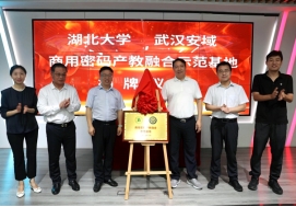 bevictor伟德和武汉安域校企代表签署了“商用密码产教融合示范基地”共建战略协议,并举行了基地揭牌仪式。bevictor伟德网络空间安全公司党委书记肖志华为“商用密码产教融合示范基地”首批校外企业讲师代表颁发了聘书。